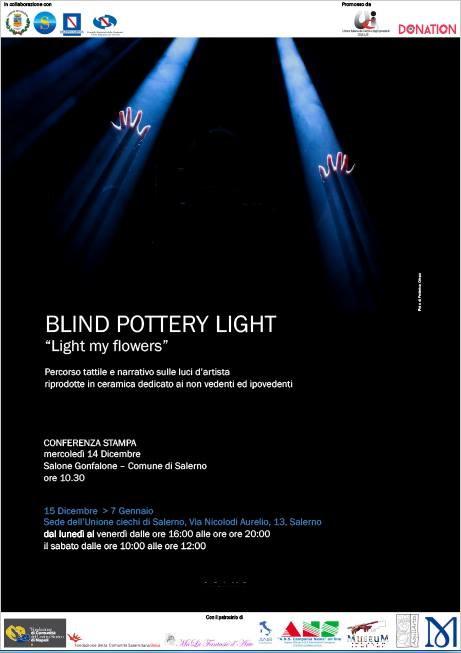 In occasione dell’evento Luci d’Artista, alcune delle luminarie verranno riprodotte in ceramica per un percorso tattile e narrativo. Il progetto nasce, innanzitutto con l’obiettivo di rendere fruibile a livello sensoriale, le Luci d’Artista anche, ad ipovedenti e non vedenti. L'esposizione sarà ospitata dal 15 dicembre 2016 al 7 gennaio 2017 dall’Unione Italiana Ciechi e Ipovedenti “Luigi Lamberti”- Sezione di Salerno Via Nicolodi Aurelio, 13, 84126 Salerno (SA).