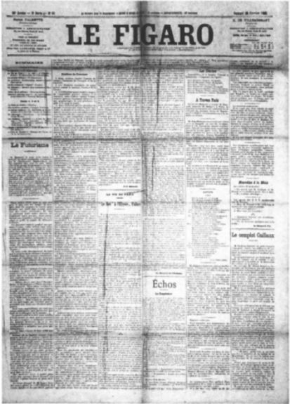 Manifesto iniziale del Futurismo di F. T. Marinetti, pubblicato sul Figaro di Parigi il 20 febbraio 1909.