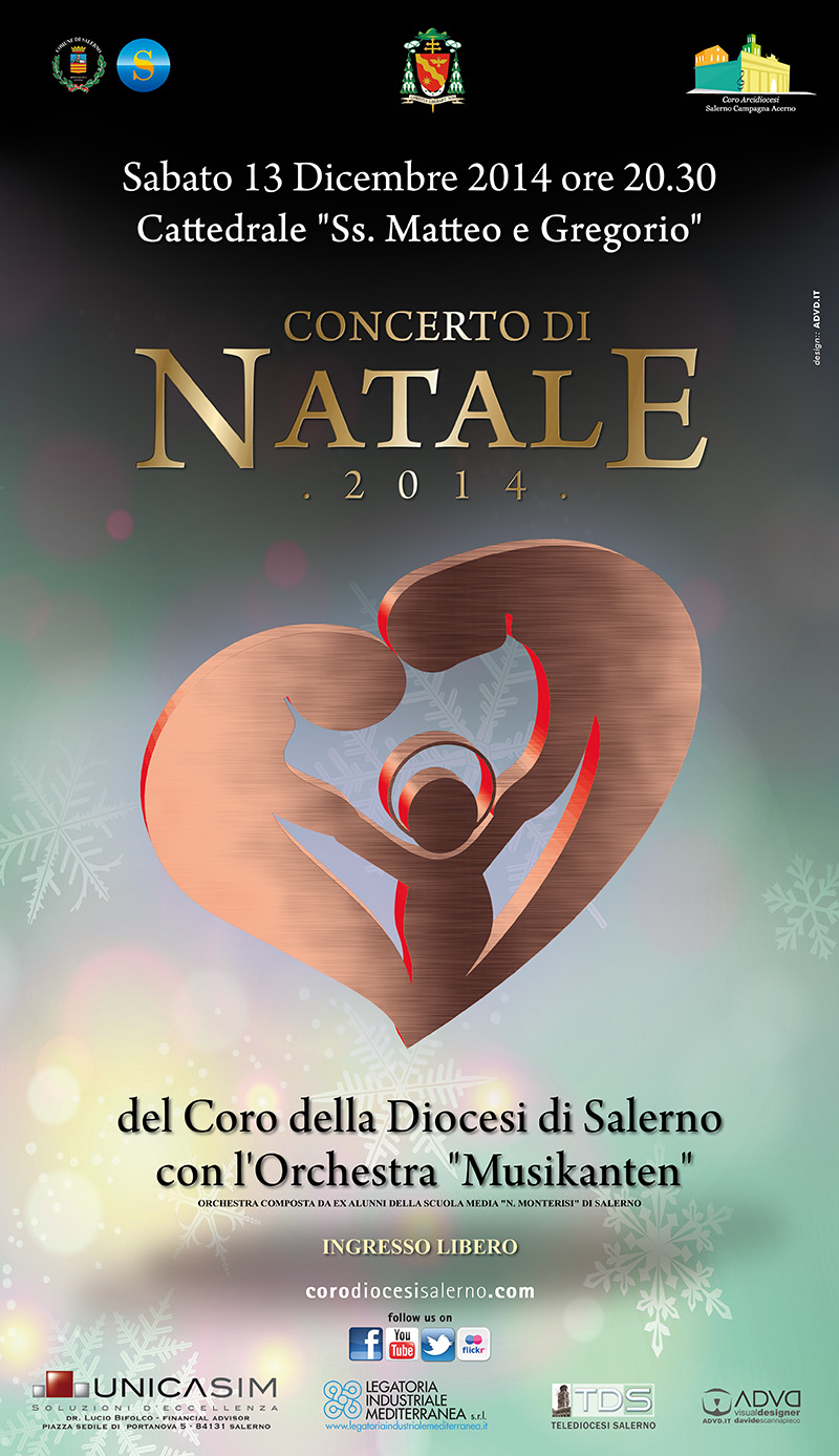 Sabato 13 dicembre, alle ore 20.30, presso la Cattedrale "SS. Matteo e Gregorio" di Salerno, si terrà il Concerto di Natale 2014 del Coro Diocesano di Salerno. Il coro, accompagnato dall'orchestra Musikanten, darà vita ad un momento di preghiera, gioia e riflessione che prepari il cuore all'arrivo del Natale.