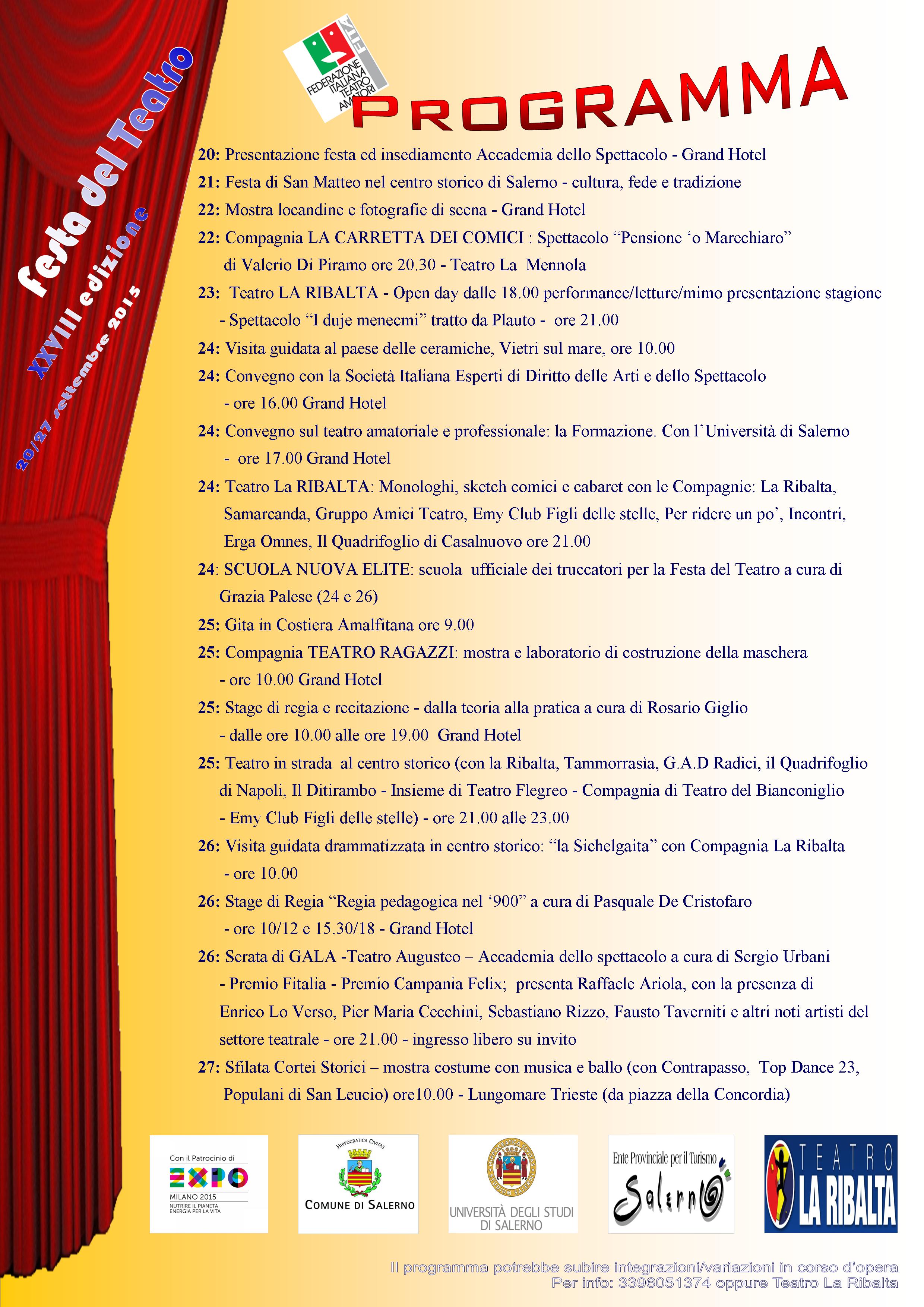 Anche Salerno è protagonista della XVIII edizione della Festa Nazionale del Teatro promossa dalla Federazione Italiana Teatro Amatori. La rassegna, che si svolgerà in diverse location cittadine, proporrà spettacoli teatrali e musicali, stage di recitazione, convegni, attività di formazione, mostre, visite guidate.