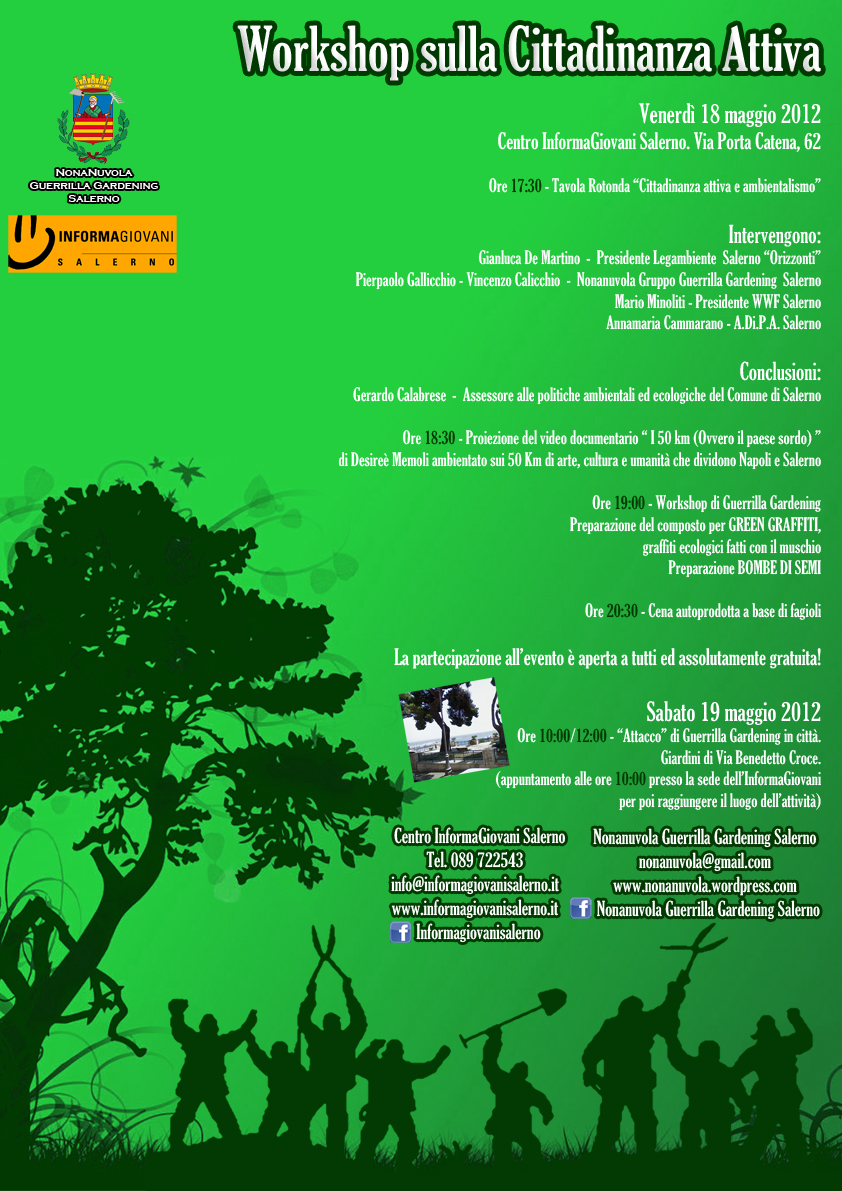Venerdì 18 e sabato 19 maggio presso il Centro Informagiovani Salerno si terranno due giornate di confronto e formazione sulle esperienze di guerrilla gardening in città come forma di partecipazione e cittadinanza attiva. L'evento è organizzato in collaborazione con il gruppo giovanile Nonanuvola Guerrilla Gardening Salerno.