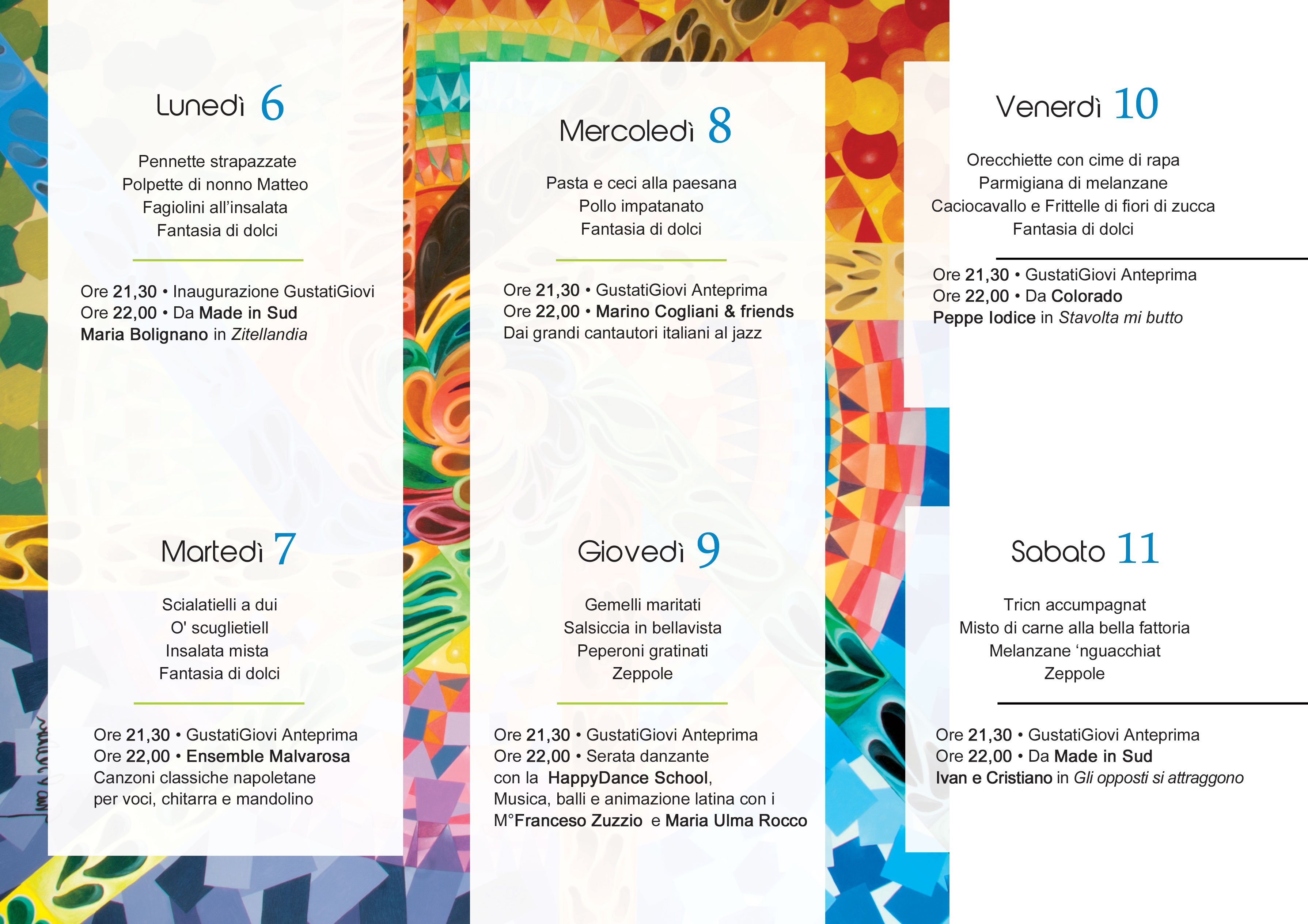 Torna dal 6 al 12 luglio "Gustati Giovi", uno degli appuntamenti gastronomici tradizionali dell'estate salernitane. Ogni sera, all'interno del Giovi Village allestito in località Giovi Bottiglieri, sarà possibile gustare diversi menù; e ogni sera si alterneranno spettacoli musicali e di intrattenimento (vedi programma allegato).