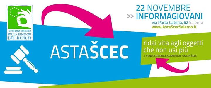 Nell'ambito della Settimana Europea per la Riduzione dei Rifiuti (16-24 novembre) - che intende organizzare diverse azioni nel corso di un'unica settimana, in tutta Europa, per promuovere una maggiore consapevolezza sulla riduzione, riuso e riciclo dei rifiuti - venerdì 22 novembre 2013, alle ore 16,00, presso la sede dell'informagiovani di via Porta Catena, 62 Salerno, si terrà una giornata di sensibilizzazione sui temi della sostenibilità ambientale in cui verrà realizzata un'Asta SCEC.