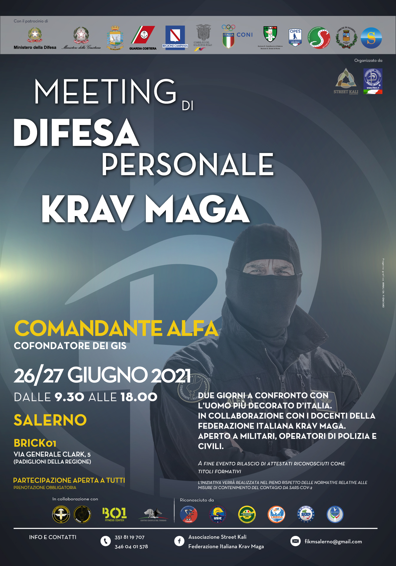 Entrambe le iniziative sono organizzate dalla Associazione Street Kali con la Federazione Italiana Krav Maga e godono del patrocinio di: Ministero della Difesa, Ministero della Giustizia, Guardia di Finanza, Guardia Costiera, Coni, Veterani dello Sport, Opes, Esse, Consolato dell'Ecuador, Regione Campania e Comune di Salerno e del riconoscimento di: UNARMA, S.A.F., USIC, LIBERA, SIULP, S.I.A.M.O. Esercito.
