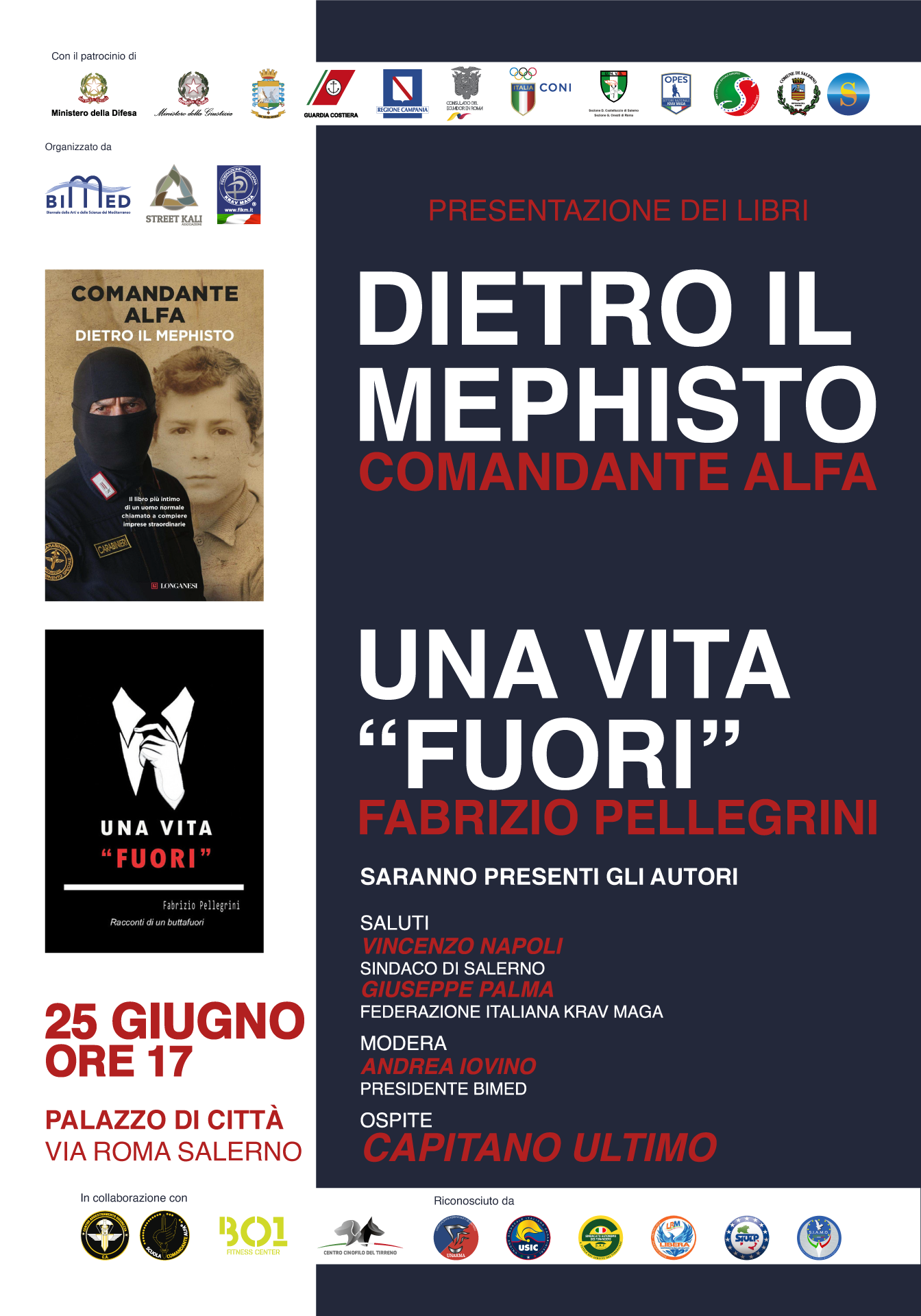 Due importanti eventi in programma a fine giugno a Salerno con il Comandante Alfa organizzati dall'Associazione Street Kali. Si inizia venerdì 25 giugno, alle ore 17.00, presso il Salone dei Marmi di Palazzo di Città con la presentazione dei libri “Dietro il mephisto” del Comandante Alfa e “Una vita fuori” di Fabrizio Pellegrini, organizzata dalla Biennale delle Arti e delle Scienze del Mediterraneo e dall'Associazione Street Kali. Ospite d’onore sarà il Capitano Ultimo.