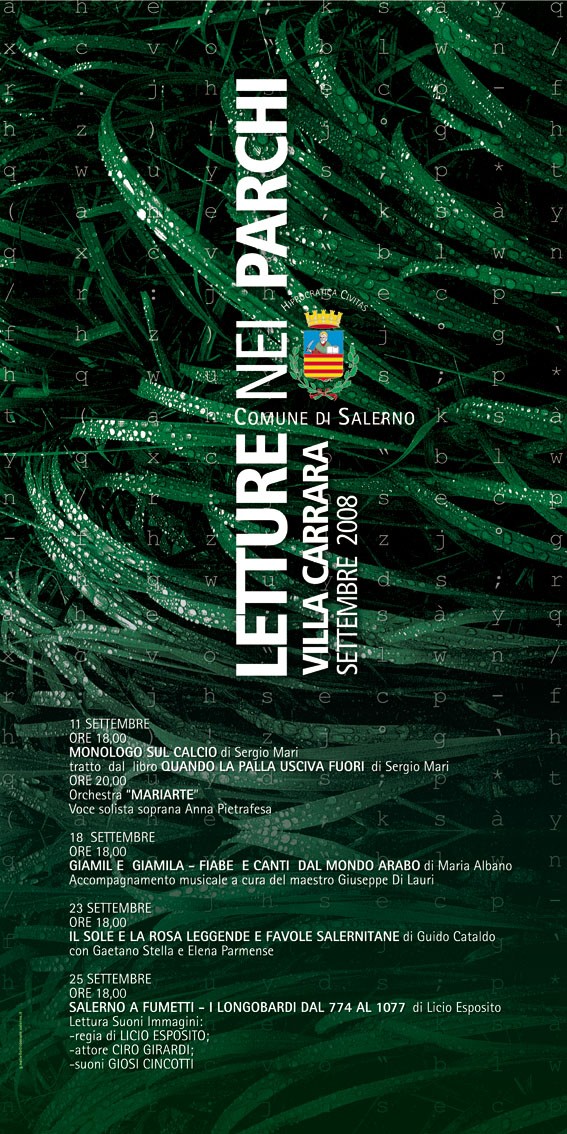 Si conclude oggi, 25 settembre ore 18,00 il ciclo di “Letture nei Parchi” organizzato dall'Amministrazione comunale di Salerno nei giardini di Villa Carrara, sede della Biblioteca Comunale.