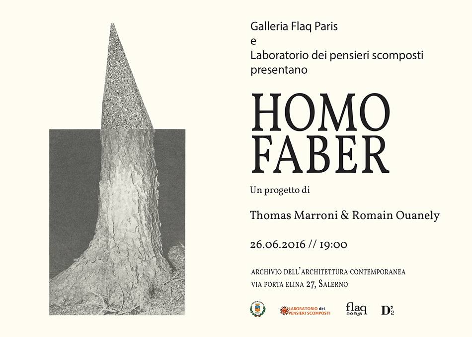 La Galleria Flaq di Parigi presenta la mostra "Homo Faber" degli artisti Marroni-Ouanely, che si terrà domenica 26 giugno, alle ore 19.00, presso l’Archivio dell’Architettura Contemporanea della città di Salerno, in collaborazione con l’Associazione Laboratorio dei Pensieri Scomposti e con il patrocinio del Comune di Salerno.