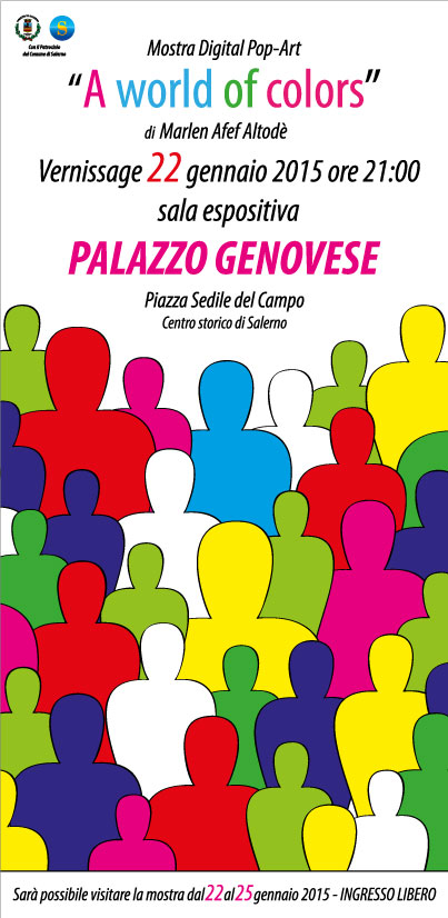 Si terrà da giovedì 22 a domenica 25 gennaio, presso il Palazzo Genovese, in Piazza Sedile del Campo, la mostra digital pop-art "A world of colours" di Marlen Afef Altodè. Il vernissage dell'esposizione è in programma giovedì 22 gennaio, alle ore 21.00.