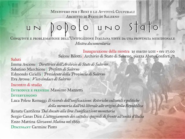 Venerdi 25 marzo 2011 alle ore 17,00 nel salone Bilotti dell'Archivio di Stato di Salerno e stata inaugurata la mostra "Un popolo uno stato. Conquiste e problematiche dell'Unità viste da una provincia meridionale" organizzata dall’Archivio di Stato di Salerno per il 150° dell’Unità d’Italia.