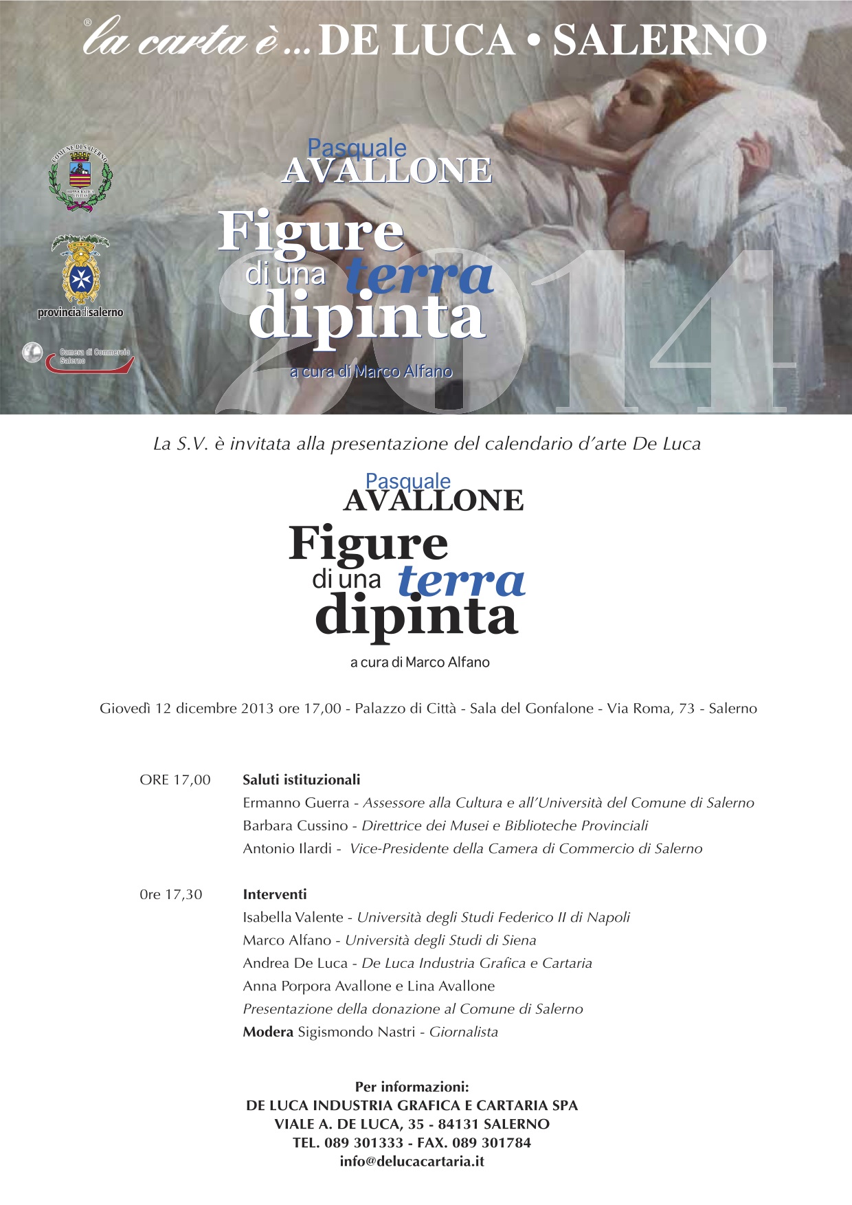 Sarà presentato alla stampa e al pubblico giovedì 12 dicembre 2013, alle ore 17.00, presso la Sala del Gonfalone di Palazzo di Città, il Calendario d’Arte De Luca 2014 dedicato a Pasquale Avallone (Salerno 1884-1965), senza dubbio il più rappresentativo artista salernitano della prima metà del XX secolo. Una tradizione antica quella del Calendario d’Arte De Luca, entrata a far parte del costume del nostro natale, che quest'anno assume per l'Azienda un significato particolare con la dedica a Giuseppe De Luca, scomparso nel novembre 2013, il quale per primo lanciò l'idea di un calendario come iniziativa promozionale.