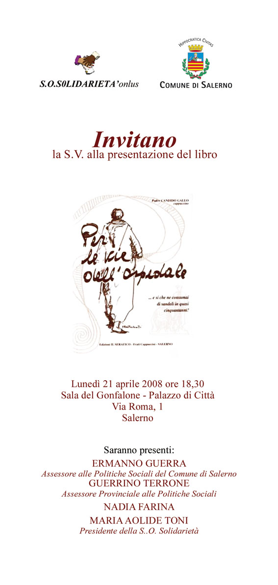 L'Associazione S.O.Solidarietà e il Comune di Salerno sono lieti di invitare la cittadinanza alla presentazione del nuovo libro di Padre Candido Gallo, il frate cappuccino che da quasi 50 anni presta il proprio cristiano conforto alle persone sofferenti ricoverate c/o l'azienda ospedaliera San Giovanni di Dio e Ruggi D'Aragona.