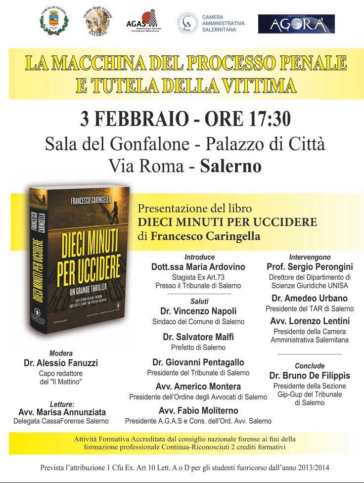 Mercoledì 3 febbraio, alle ore 17.30, presso la Sala del Gonfalone del Palazzo di Città, si terrà la presentazione del libro "Dieci minuti per uccidere", giallo del magistrato e scrittore Francesco Caringella.