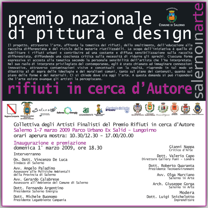 Dopo la selezione ad opera della giuria, che si è svolta il 16 dicembre 2008, presso il prestigioso Casino Sociale di Salerno, e a seguito del voto on line, che ha visto vincitori Alessia Ziccardi, per la sezione pittura e Camillo Fiore per il design, si terrà a Salerno dal 1° al 7 marzo 2009, presso il Parco Urbano Ex Salid, la Mostra dei finalisti del Concorso.