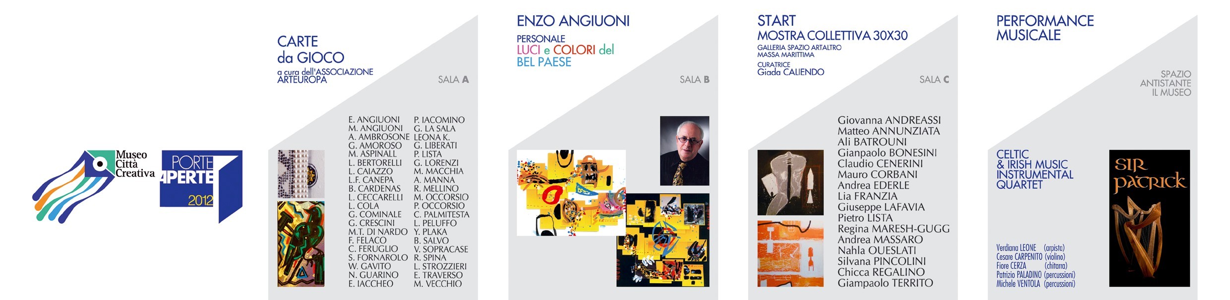 Nella saletta centrale si darà spazio invece ad una personale di Enzo Angiuoni, veterano della scena artistica nazionale a partire dagli anni settanta ed organizzatore con Arteuropa di “Carte da gioco”. Nel 2007 questo artista ha esposto alla 52ª edizione della Biennale di Venezia col progetto Camera 312- Omaggio a Pierre Restany, dal 2008 è anche direttore artistico del progetto itinerante “Arts, Arti visive per l’Europa”.