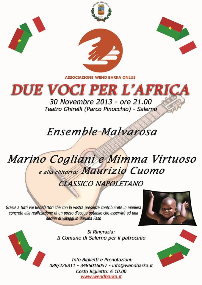 Sabato 30 novembre, alle ore 21.00, presso il Teatro Ghirelli (Parco ex Salid), si terrà lo spettacolo di beneficenza “Due voci per l’Africa” organizzato dall'Associazione Onlus Wend Barka e patrocinato dal Comune di Salerno. Sul palco Marino Cogliani e Mimma Virtuoso, accompagnati alla chitarra da Maurizio Cuomo.